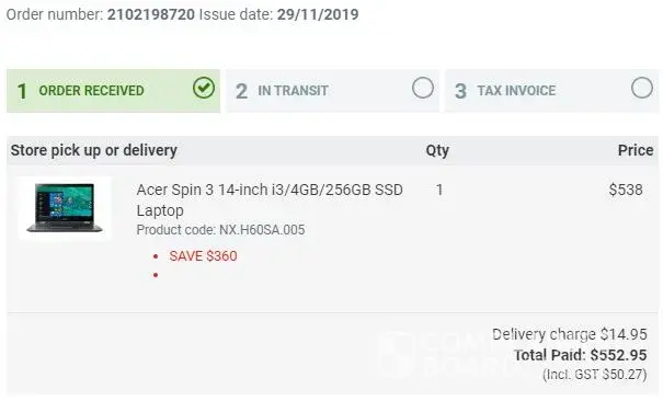 24/12/19- I ordered 3 lap tops for my children for Xmas 3 weeks ago. I followed up a week ago as I had not received a response, I was told they would be in Moonah on Friday or Saturday. I then again followed up on Friday to be told they would be on the courier and should arrive on Saturday and call me back. With no returns calls I called again on Sunday (no answer) and Monday. I was then told that they would forward it on Courier to arrive that afternoon. I have since called again to be told that they had not arrived. I am again waiting on my 4th return call with an update.