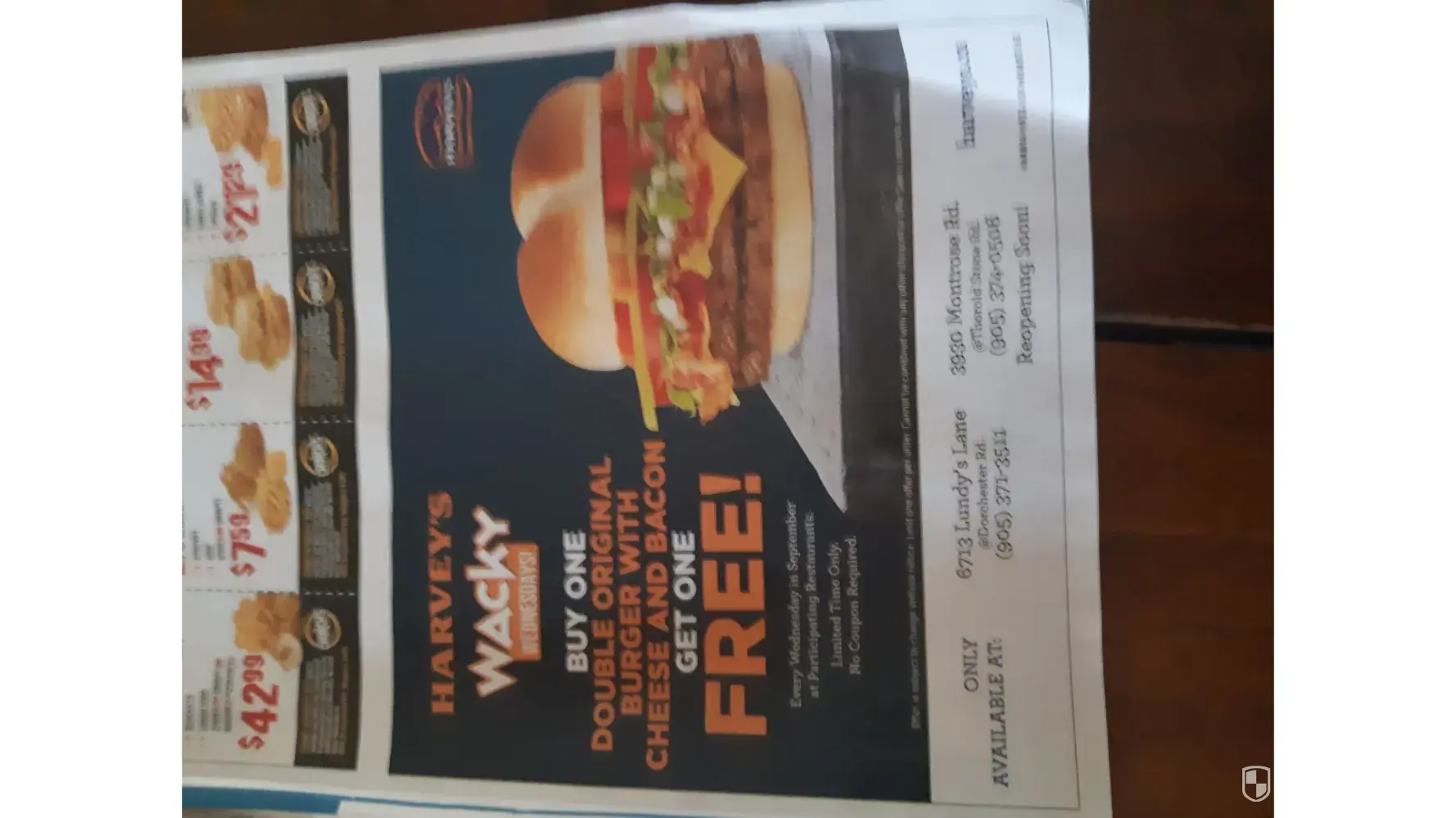Harveys wacky Wednesday double orginal burger with cheese and bacon buy one get one free . This add was in Niagara money saver. The harveys app for the Lundy lane Niagara Falls location has the burger for $8.69 +tax =$9.82 . I did not order through the app because we had a few stops to make before we arrived at the Harveys. When we ordered the lady told me the double orginal cheese and bacon burger was $13.78. She said the cheese and bacon on the second burger was extra. I showed her the add in the flyer. She took the cheese and bacon charge off but still over charged me. She charged me $11.40. The point i want to make is the fact of is poor advertising and following through with pricing.