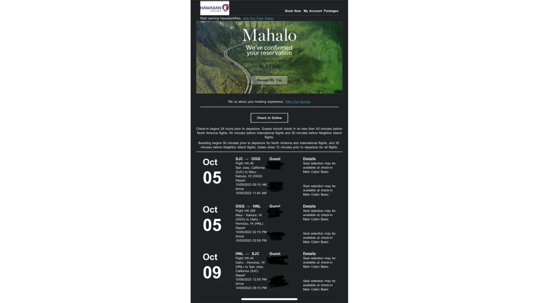 After the trip I tried to submit an online form via Hawaiian airlines website but the website rejected my form because it does not recognize our confirmation code. I called customer service and got more runaround. Long story short I just hung up.