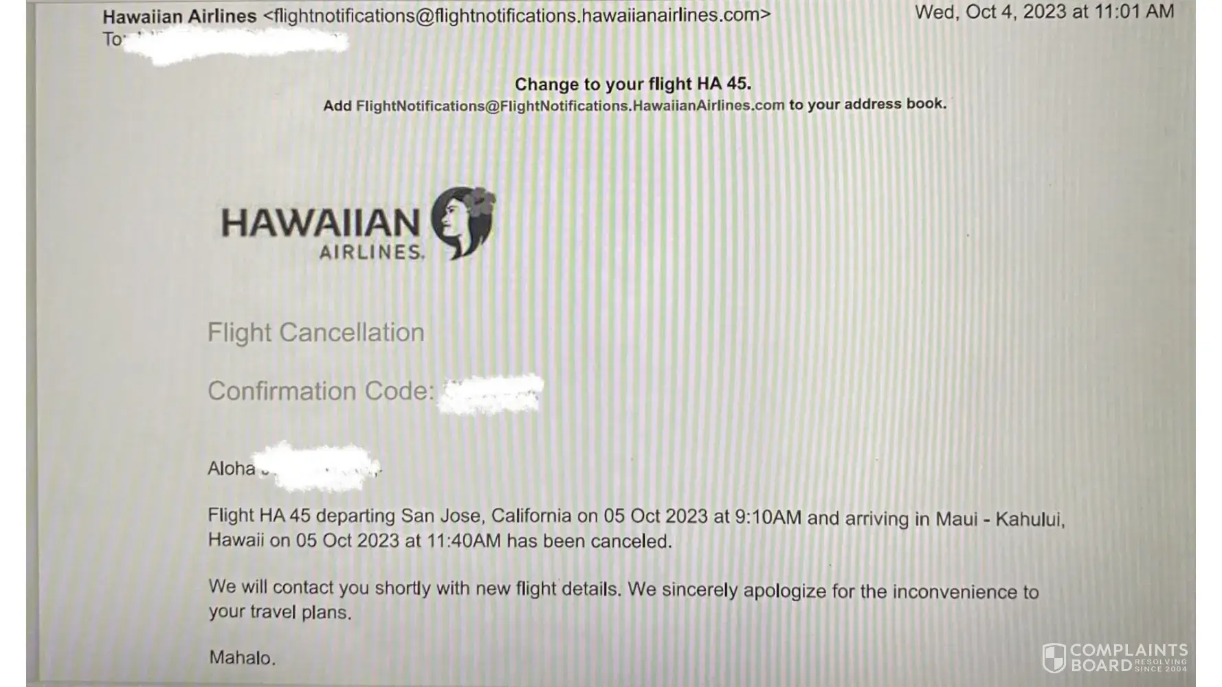 Desired outcome: We are requesting Hawaiian Airlines to compensate us for the stress and inconvenience that this cancellation and delay had caused.