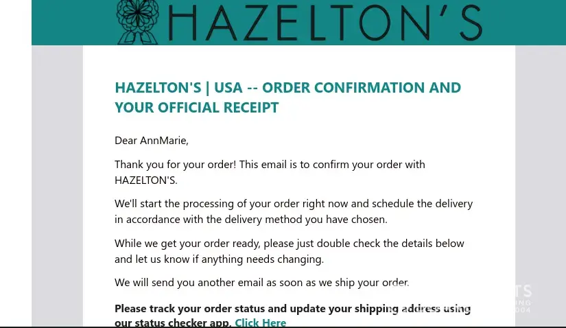 Our cousins in England purchased a gift basket from this company on December 19/20. After no received the product we followed up from our end here in Canada as to where the basket was. I received an email from Amman from Hazeltons who advised the basket had been shipped yesterday and was out for delivery today.