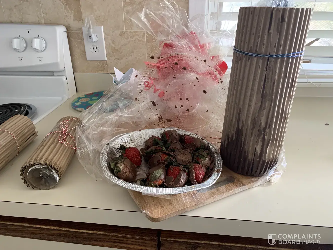 Our son who lives in Langley, British Columbia ordered a gift box from Hazelton's of Scarborough, Ontario, to be delivered to Destin USA. He sent the order on Monday December 9th, USA on December 13th 2019, for my husband birthday. The package was delivered on Monday 16th December so three days late, it was in a huge box with no indication of the up or down side, so when the parcel arrived the bottle had mashed the chocolate covered strawberries, and it was full of strawberry juice in the box. I sent an email to complaint but they say that there is nothing they can do because it was perishable item, sorry but if it was delivered on time in a proper box it would not happened!