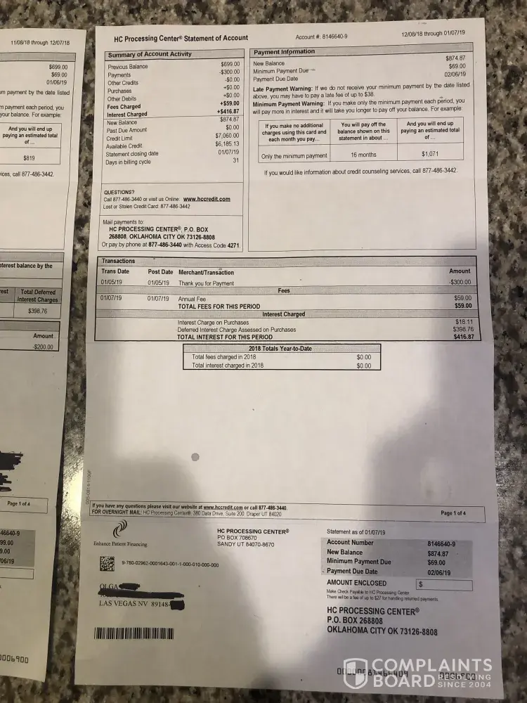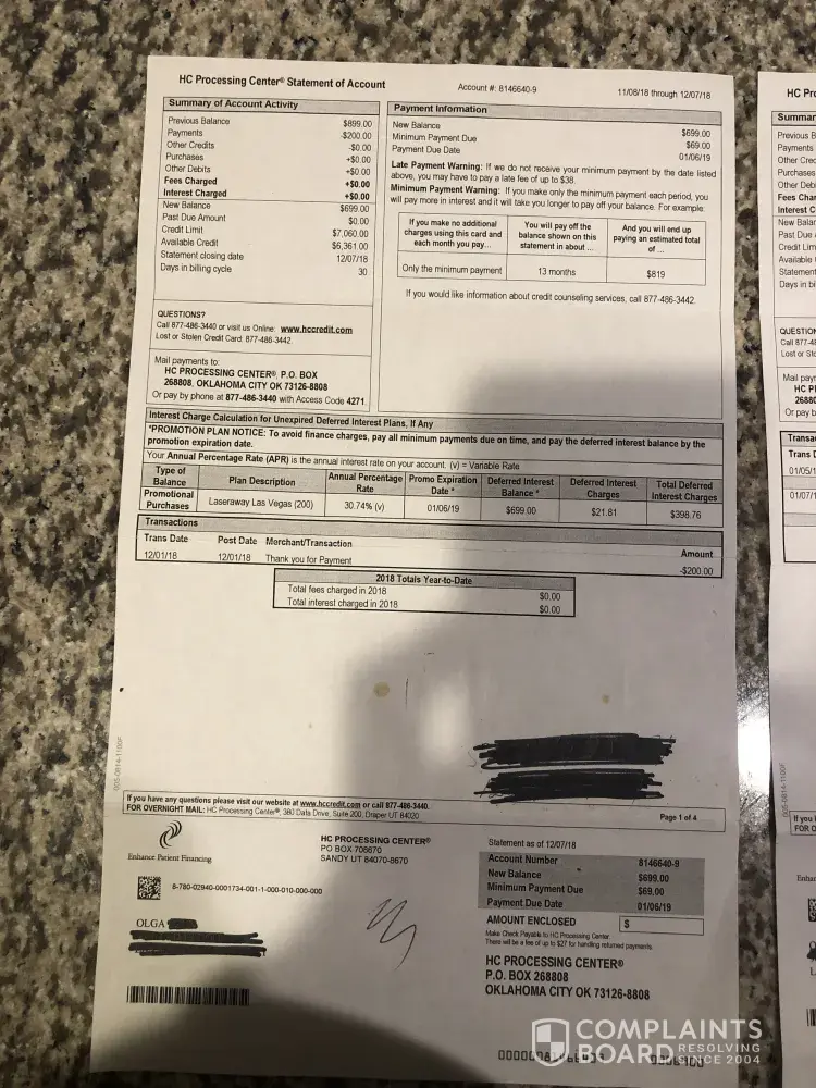 My story starts when deciding to have some laser treatments done with a company in vegas. The laser company's working apparently with hc processing center so that's where I received the loan from.