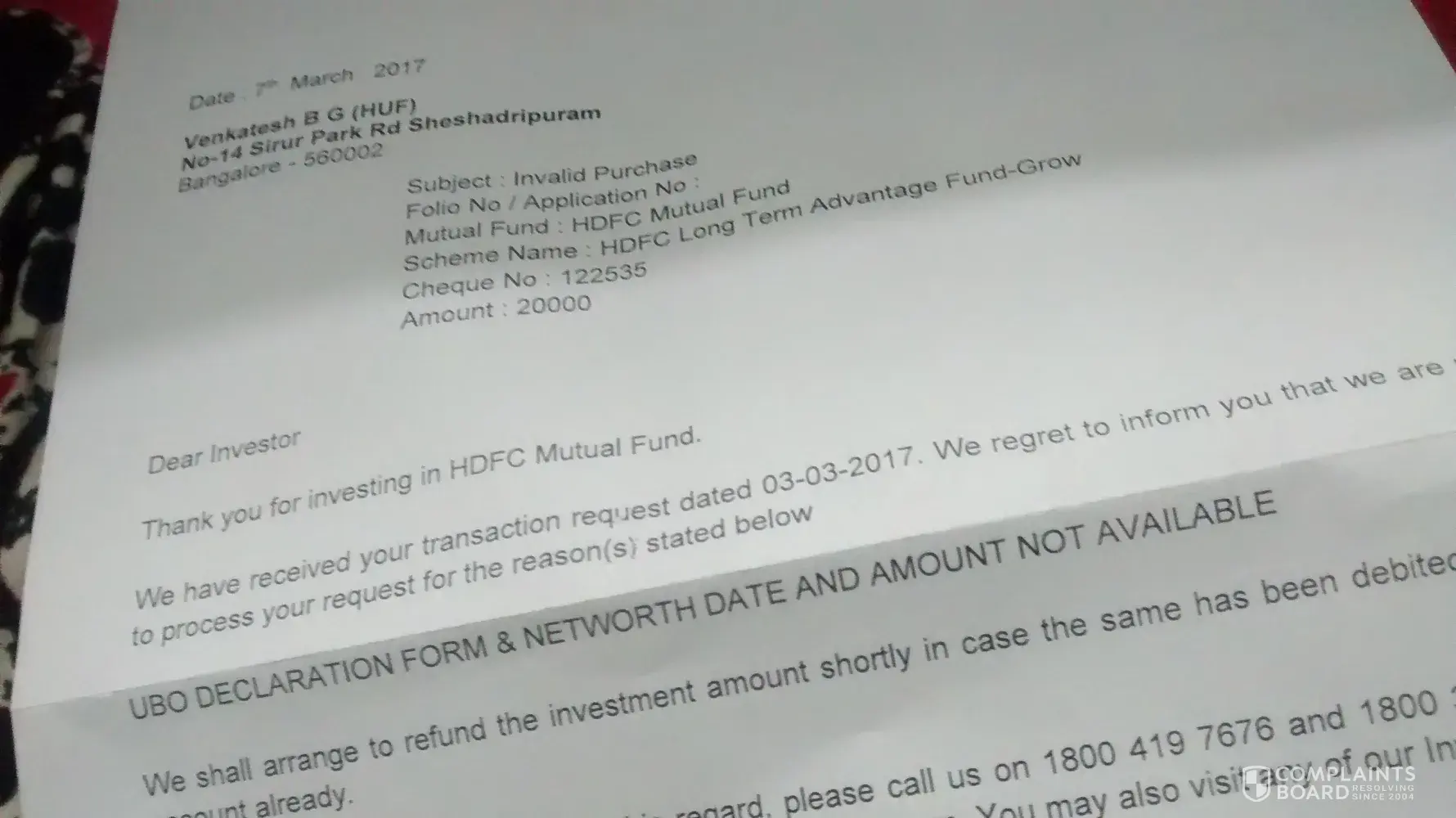 I drvenkatesh BG had applied for HDFC long term advantage fund on 27th of February and the amount was deducted from my account on March 6th .I also received a mail stating the purchase confirmation and units will be processed subject to verification. Later I received later that units where not processed and the amount will be refunded . unfortunately amount not refunded. I mailed the costumer care where in they didn't bother to reply, I had called the toll free number and the executive is clueless on what to do.