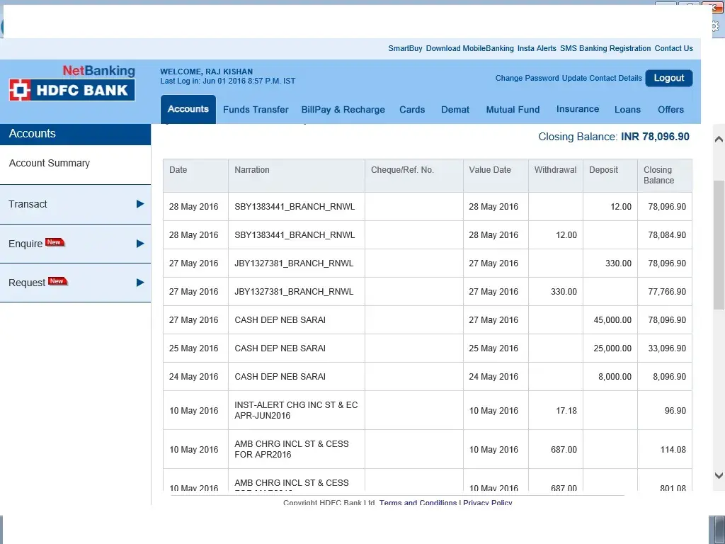 I am having a Salary account in the name of Raj Kishan (a/c- [protected]) last 2 years in Delhi.