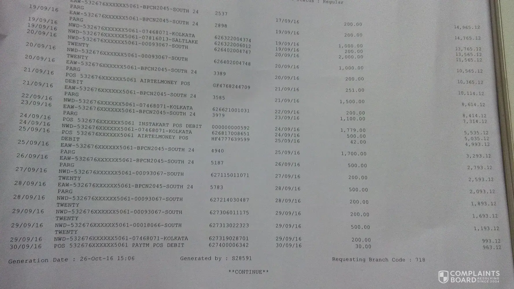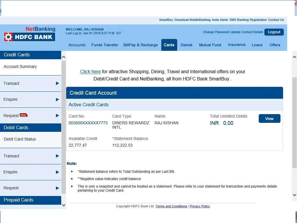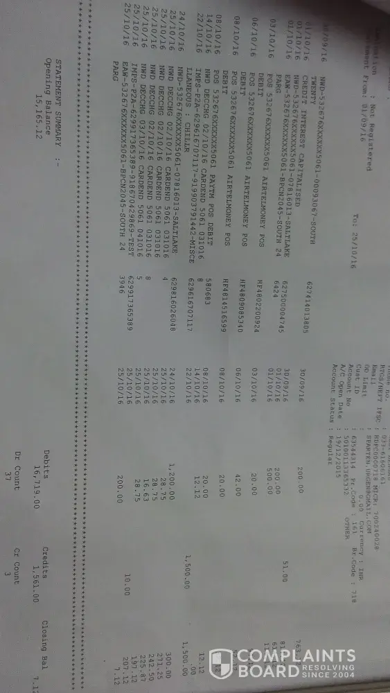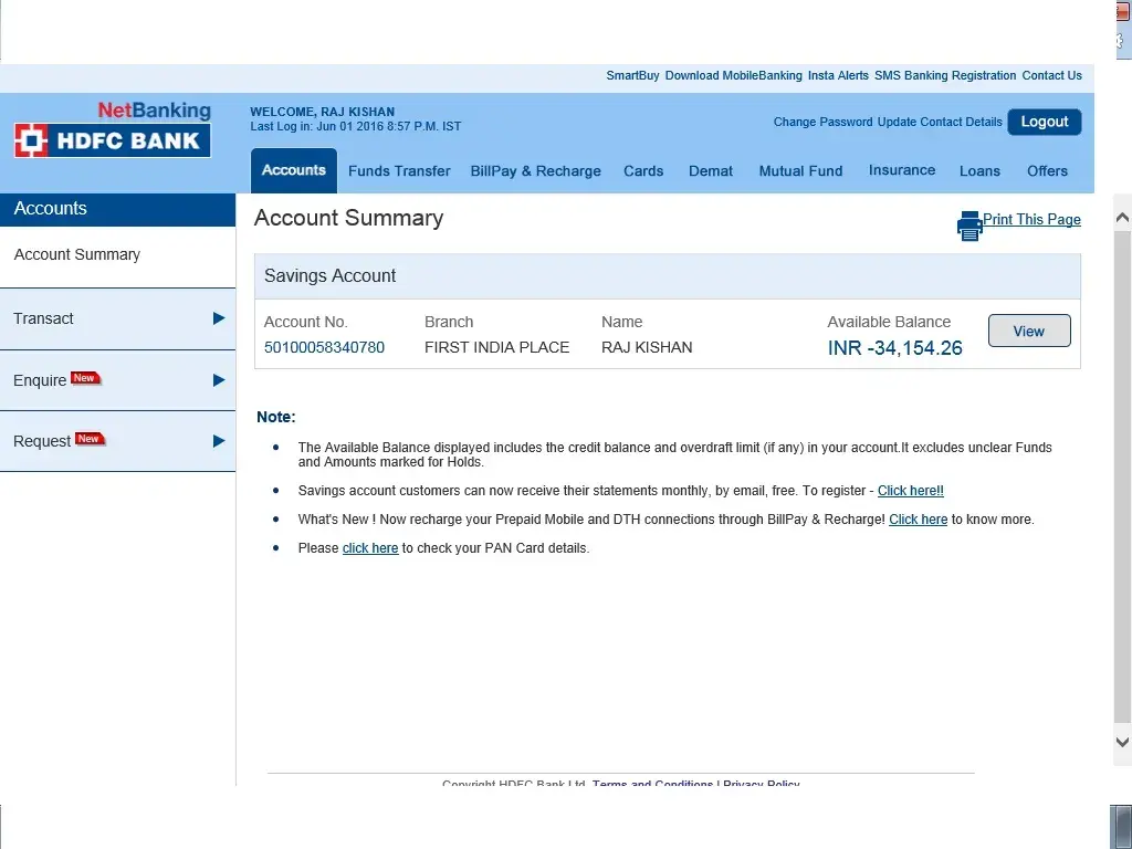 So, I made the payment on 24 mAy 2016 directly in my credit card. Then the banker where I was depositing the amount, told me to deposit the rest amount in your account instead of credit card, because my account is on hold, and I cannot withdrawal the money from my account. So, better you deposit in account, so that the credit amount will be directly deducted directly from the my account. So, I deposited Rs. 78, 000 in my account on 27 may 2016. But after depositing, my Account is still showing (Available Balance- -34, 154.26).