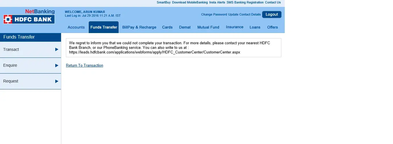 Hello Support, My Account Details: Name: Arun Kumar User ID: [protected] A/c Number: [protected] Contact Number: [protected] I tried to transfer funds from last 2-3 days, But I can't able to transfer funds to other account. I want to transfer funds Via IMPS to other ICICI bank holder. Everything is Ok steps: 1) Added Beneficiary Account. 2) Added...