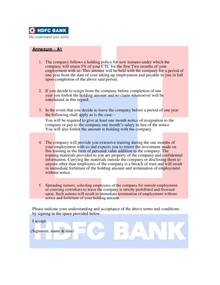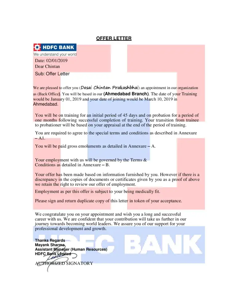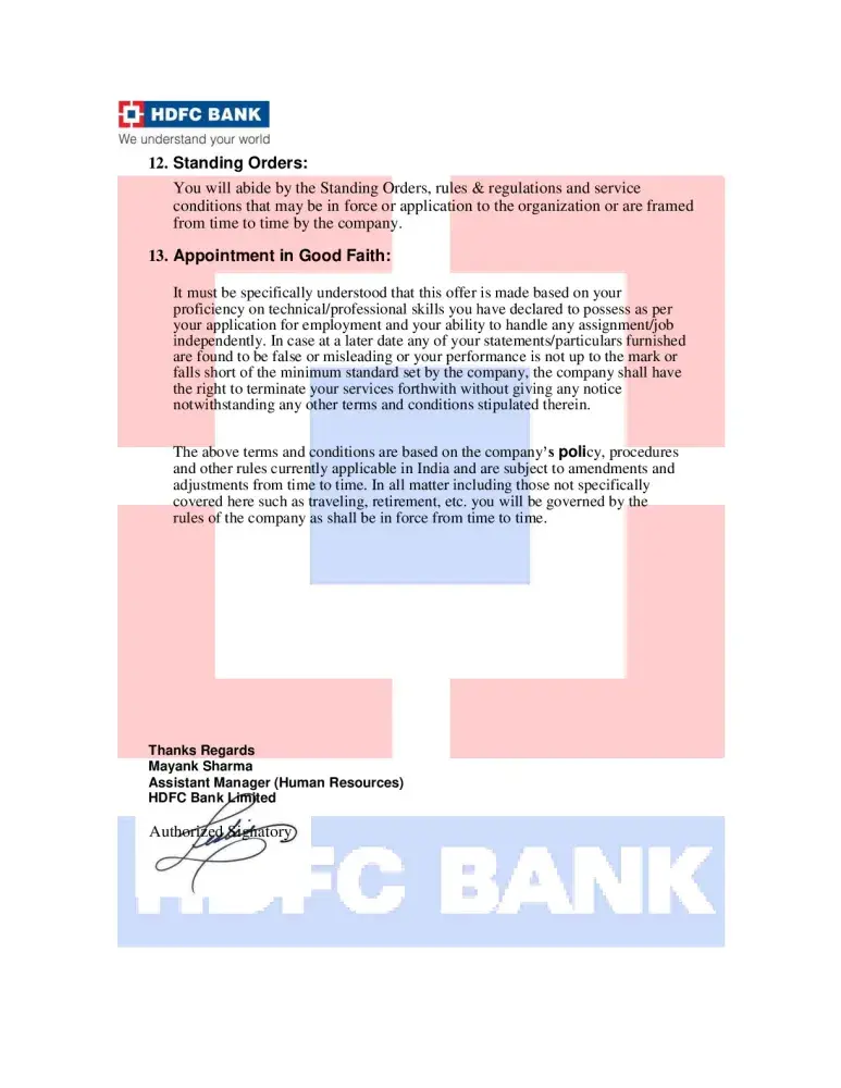 On offer later there is a sign of mayank sharma assistant manager (hr) hdfc bank limited.