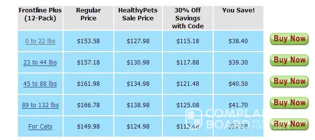 The e-mail sent to me advertised “SAVE 30% OFF Total Savings” for Frontline Plus. Above the prices shown for Frontline Plus 3-Pack, the website advertised “Marked Prices are 20% off” and below “Use coupon code PETHOLIDAY for an additional 10% off Savings!”, but the prices shown for the “HealthyPets Sale Price” was discounted 16.67% and the “30% off Savings with Code” price was discounted only 25%.