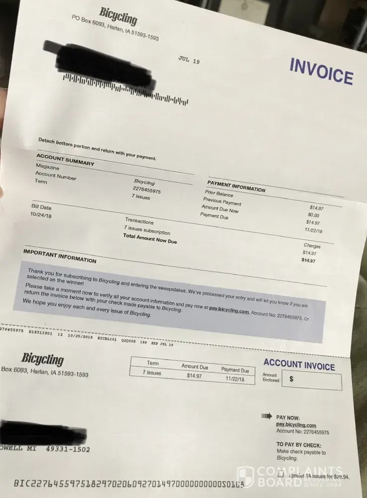 My husband had now received two invoivces within one week of each other from the Hearst Communications company. The first one was for auto parts and the second one a bicycling magazine. The bicycle magazine appearntly was started on 8/24/2018. I then got the first invoice on 8/25 for the auto parts one and the bicycle one on 11/2. My husband nor I signed up for these. I called them twice now and cancelled both. I asked for a supervisor and they said none was able to take my call. They are located in the Philippines. I asked for them to check and see if I had any other subscription and are names that we did not sign up for. She just kept saying this one was cancelled and could not confirm if I did or did not. So annoying!