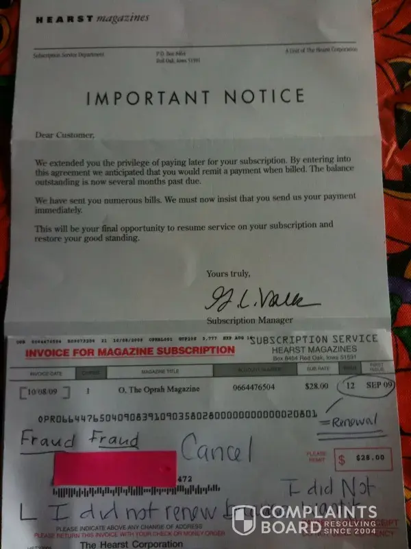Recieved a letter from Hearst Magazines today stating that I did not send in payment when I indicated on a subscription card that they could "bill me later". This was in Oct of 2008 and it is 9/23/09. After spending a good hour on line attempting to find a phone number for Hearst--I called the folks at Food Network Magazine and was told by the agent there that Hearst owns them and that she could help me with my Good Housekeeping issue. I told her that I sent in payment Oct 22 2008 and that I have proof that the check cleared my bank. She told me that the letter was for an automatic renewal--i never agreed to that-- and that she would cancel the renewal--we'll see--This letter in no way states that it is for a renewal and of course does not include a phone number to call them. I will no longer deal with this company as it is poor business practice to send a letter to someone with the intent of accusing them of failure to pay and not include a phone number for the customer to call. Furthermore, to automatically renew a person's subscription without their authorization is fraudulant! Now I can see why my mother who is afflicted with Alzheimer's has 3 magazine subscriptions renewed until 2015! This is a consumer scam, Hearst knows it and yet no one has taken them to task about it. I think everyone that has experienced this needs to contact their state's attorney general's office and file a complaint. Maybe then this will stop. Thinking also that the phone call I made today will not take care of this matter--will wait and see!