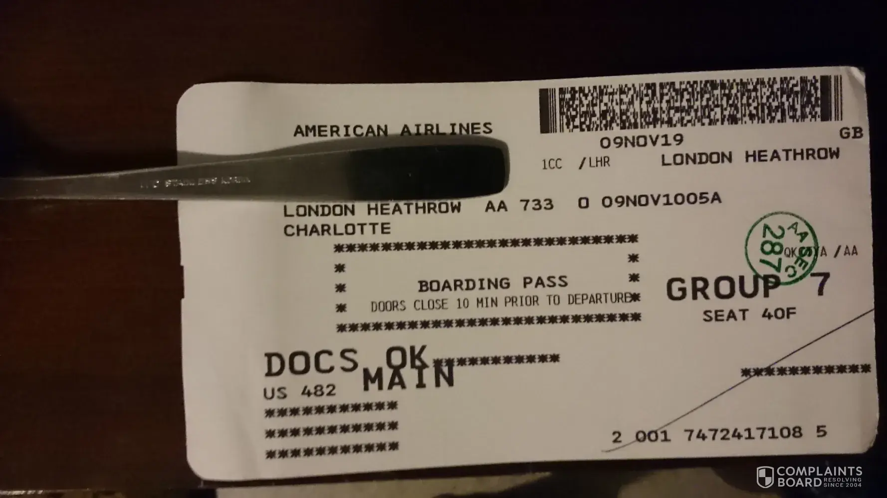 AA Flight 733 to Charlotte on 9 Nov 2019.