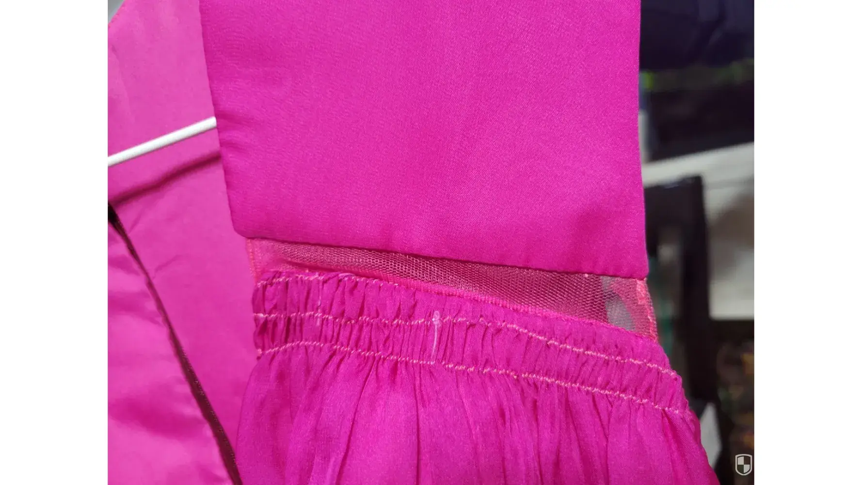 The dress is uneven and there are various areas with pieces of fabric being ripped or not stitched.