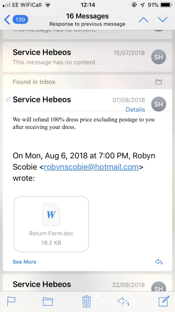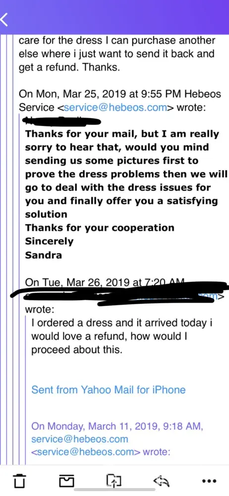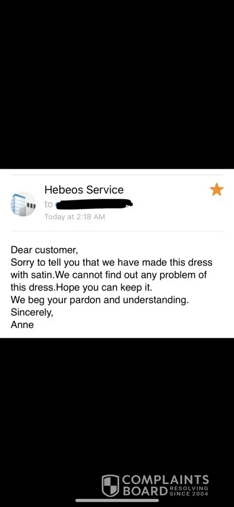 Hebeos is giving me issues processing a return. They are stating that I asked for a request after the dress was tailored. I originally asked for the dress to have sheer darkened and back covered. I emailed and stated to disregard the sheer. They emailed and asked to disregard the message. I said correct. Then I noticed want they sent which was my whole message. I sent email stating I still want the back covered. I wrote back on Jan 7 to confirm that I wanted the back covered after someone said we will make the dress as the picture on Jan 7. I told them on the same day no make it with back covered. Jan 8 I receive an email that dress is under tailoring. I wrote back on Jan 9 stating please make sure the back is covered. I want to confirm we have an understanding on that. Alice wrote we got that don't worry on Jan 10. I receive the dress and the back is not covered. I emailed to have dress returned to tailor as requested. Anne is stating that on Jan 7 I stated to ignore my note so they made the dress as pictured and when I sent an email that I wanted it covered, the dress was finished. I do not believe this to be true. On January 7 Alice said they will make dress as picture. I sent the email Jan 7 to cover the back. Received email that dress was still being tailored on Jan 8. (So how was the dress already completed if it was still being tailored?) I emailed back Jan 9 to cover the back. Jan 10 Alice state they got that don't worry. So from Alice's email I got an understanding that they received the request/email to cover the back and they did cover the back. I receive the dress and the back was not covered. I am requesting for the dress to be approved for return, Hebeos pay for the return and a partial refund for my time wasted going back and forth and not honoring my request when I sent the request to clarify my statement about want I wanted right after Alice said she will make dress as pictured I said no I don't want it as the picture on the same day. Below I have the emails showing the conversations. I apologize for the spaces. If you need me to send you the email separately please let me know.