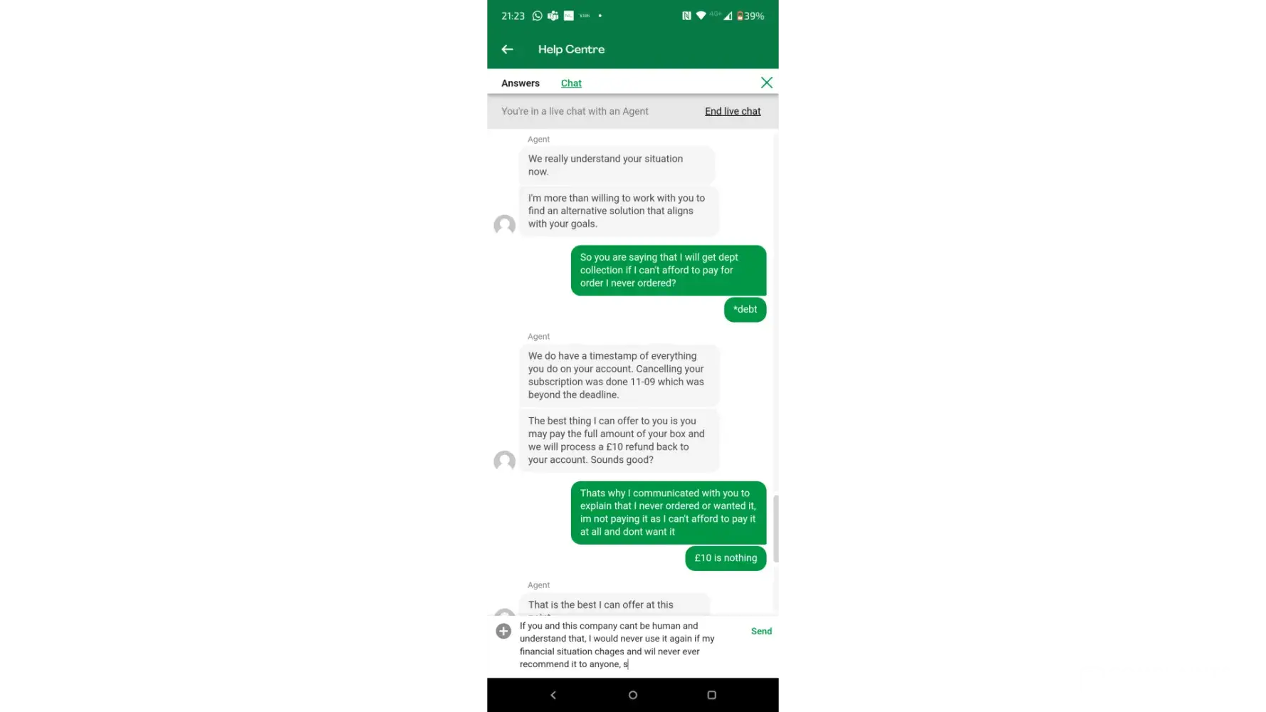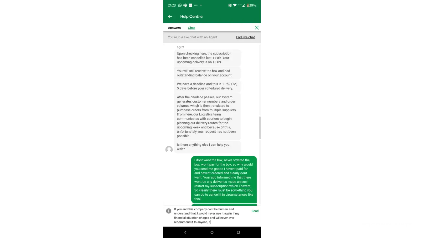 Hi, I paused my box subscription and was under impression that it wont restart unless I opt in to restart it again. As I noticed email saying that I owe them money for my next delivery which I havent ordered and needed to cancel I contacted customer service and asked for help. I explained my situation that I Cant afford to pay and cant collect this box. Customer service representative wasn't helpful at all and said there is nothing that can be done and if I wont pay, 3rd party company will be involved to collect debt. I explained that I haven't received any goods, tried my best to inform them as soon as possible as Im struggling financially and was misled by their website and was tricked in to paying for goods I dont want or need.