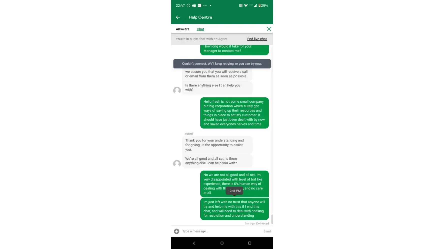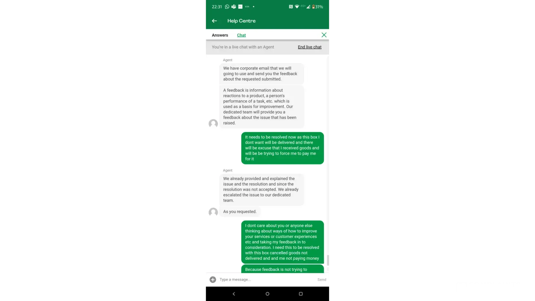 Desired outcome: I would like a response and I think you need to review these companies and get rid of the problems and provide better service. You’ve lost me as a customer