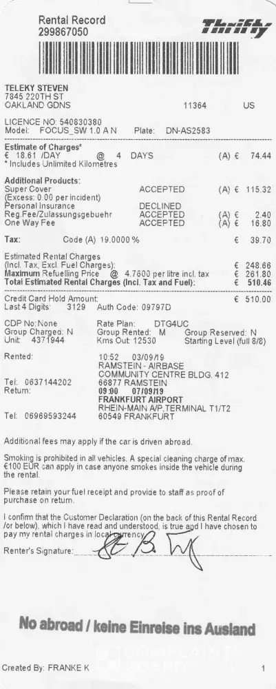 I reserved a car at the Hertz/Thrifty office at Ramstein AFB in Germany. I did this through Expedia, from which I purchased an insurance policy. When I went in to pick up my car I was told that the insurance I purchased (TravelGard/AIG) was not accepted. When I offered my credit card I was told I needed a physical copy of the policy with my name and credit...