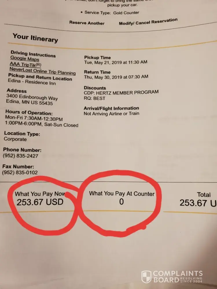 Officially filing a complaint: hertz car rental. I rented a car from hertz on my last trip to mn. May 21st thru may 30th. Pre-paid, to "save money" waited for 50 minutes while someone "brought it to the location." by the way, i'm a "gold plus member" was told that "something was wrong with my credit card" had to give them another card (I pre-paid and it already showed up on my credit card bill) still waiting... Got the car. Took the car back before the due back time on the 30th. There was a sign on the door stating the agent stepped out, "if you are returning the car, leave the keys at the front desk." (this was a hertz rental inside a marriott in edina) went to the front desk, asked the guy if they are connected to hertz and can I leave the keys? Parked the car in the hertz parking space in the parking lot.