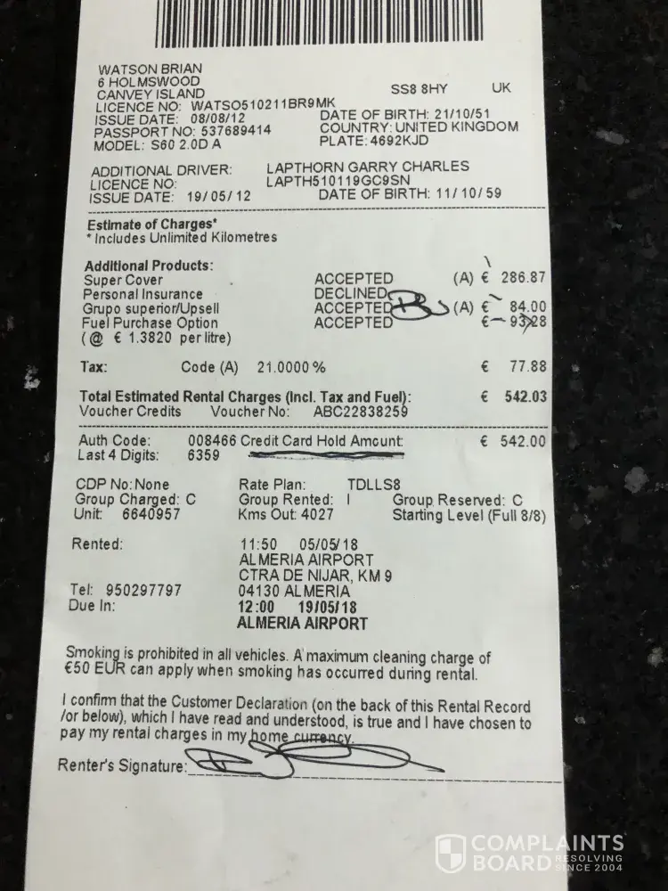 I rented a car in Madrid, Spain from 9 November 2017 to 15 November 2017, and my rental agreement number was 486465781. On 14 May 2018, I received an unauthorized charge on my American Express Card in the amount of 40 Euros (or $47.88) for an alleged traffic violation. I filed a complaint with American Express to reject the charge.