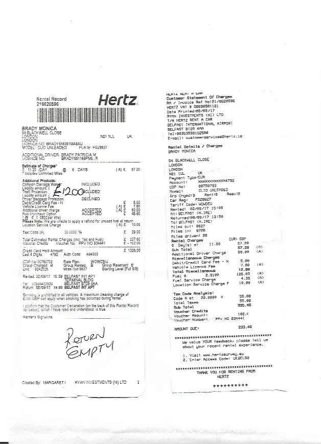 I rented a car in Belfast airport on 3 September, returning it on 8 September. When I got it, the rental record ([protected]) showed a cost of £125.60, taking into account the voucher I had of £102. Since we were adding a driver, this seemed reasonable, and we were buying petrol for £48.60 so that all seemed OK with the VAT and the other charges.