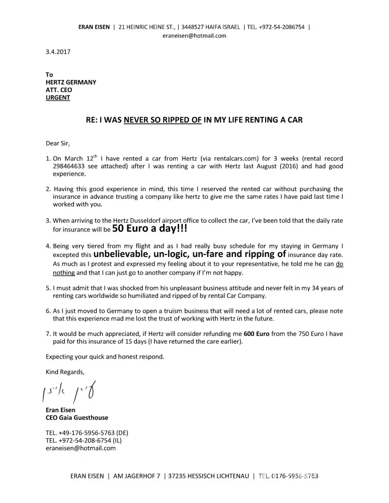 These 2 attached pages were sent to Hertz offices in Germany and UK on 3.4.2017 and never been answered. As a valuable customer, i find this kind of behavior extremely un respectful and insulting.