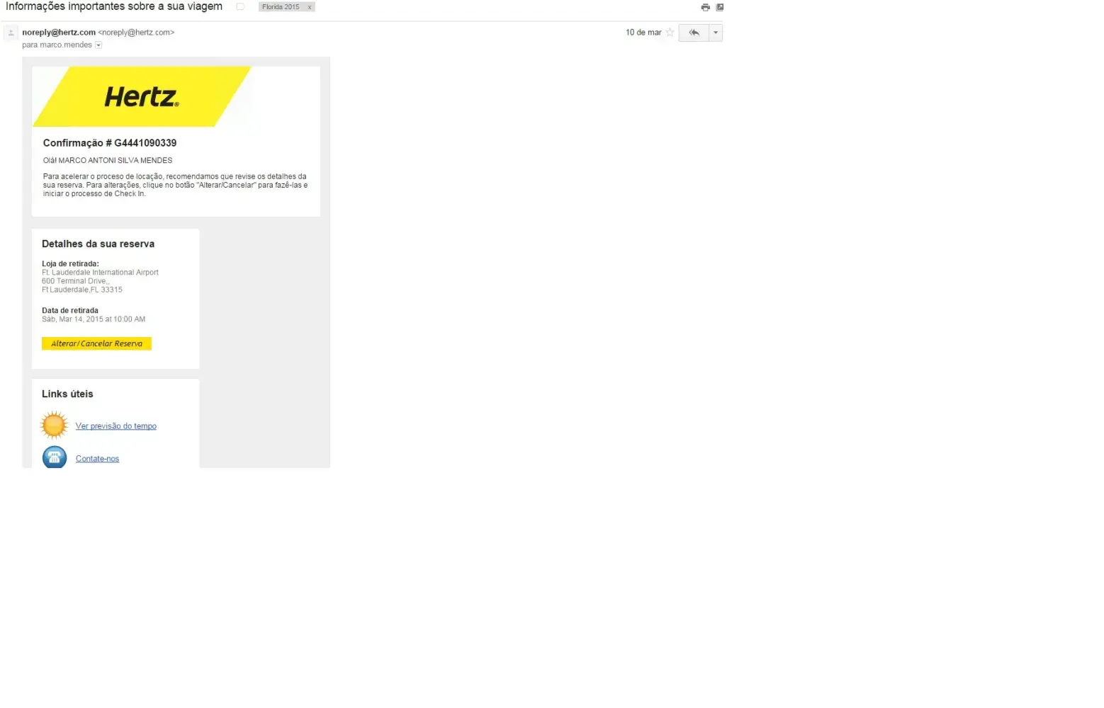 On January 2015 I've place a Adrenaline Car collection reservation for a Dodge Challenger R/T, for a rental scheduled to March 14th. On March 5th, I've made the check-in as asked by Hertz, online, stating that I would honor my rental. A couple of days before my rental date, I got an email from Hertz informing some details about my rental reservations and it was all ok.