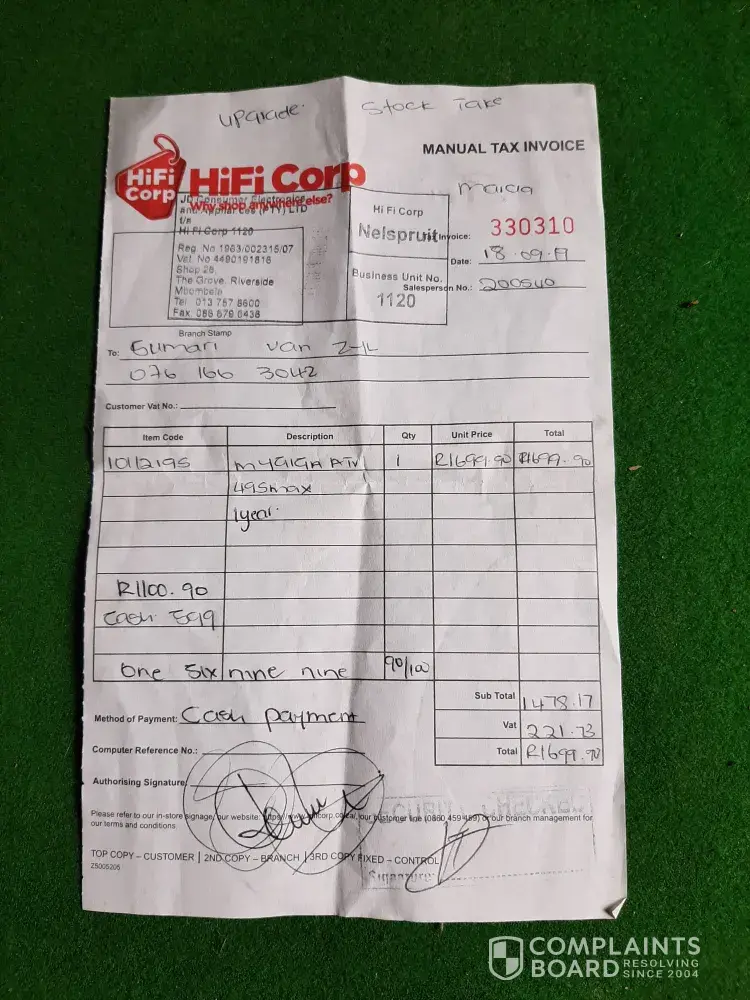 I am not looking to gain or benefit anything from HIFI Corp on this matter. I am complaining for customer service and I do not see my self buying anything again from HIFI Corp. I regret everything about laybying from them. Please assist me on this matter as soon as you can.