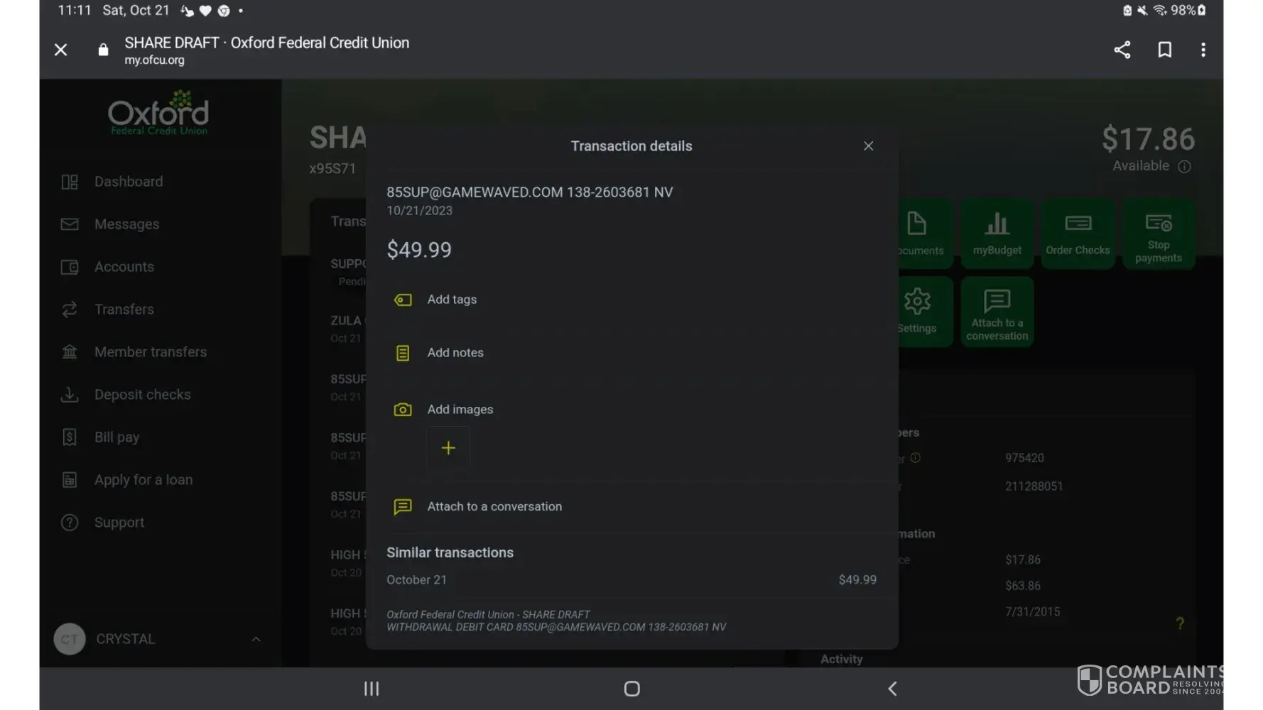 There was 2 payments of fifty dollars taken out of my account and I didn't authorize them. This was done on October 21,2023