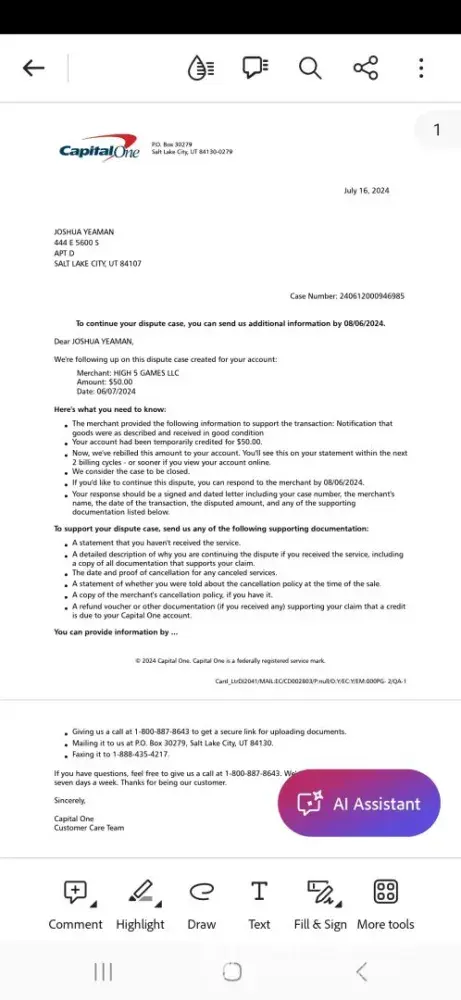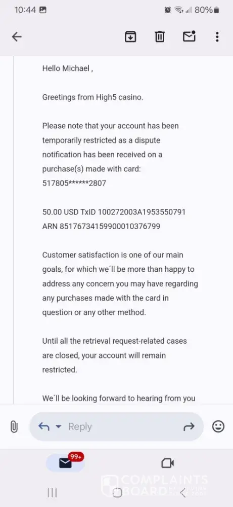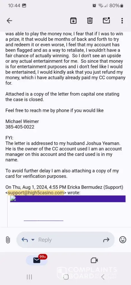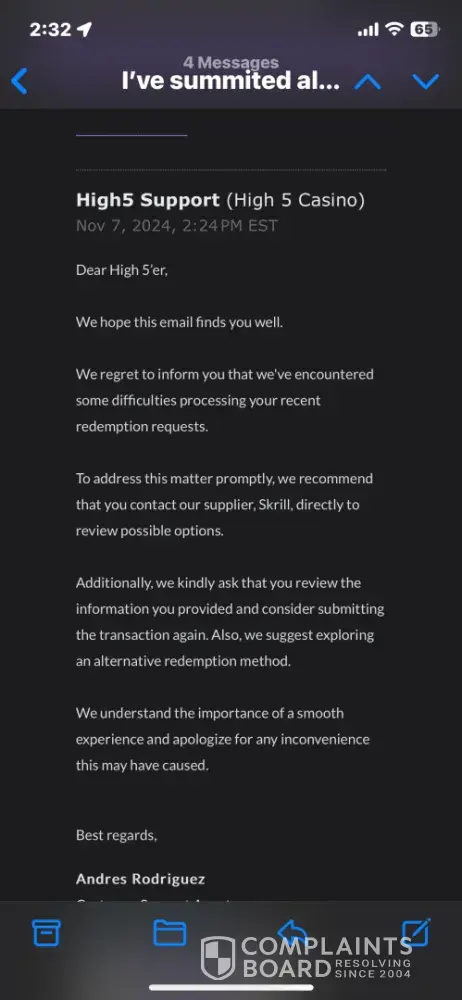 As you can see not once to the offer a solution on how to get my money back because they just want to keep it. I'm sure somewhere in there terms and conditions after a certain amount of time of "inactivity" the money is forfeited. They are just waiting on out the clock all over a measly 50 bucks. Way to go high5 way to go. What a poorly managed company that instructs their employees to steal potential customers money. The worst part of it is for them because I'm a regular player and at one site alone I played six figures in the last month alone. So they lost out on a lot more than just 50 bucks. But that's okay like I said it's about the principal not the money. I will continue to tell everyone that you are thieves until you give my money back. I'm waiting...