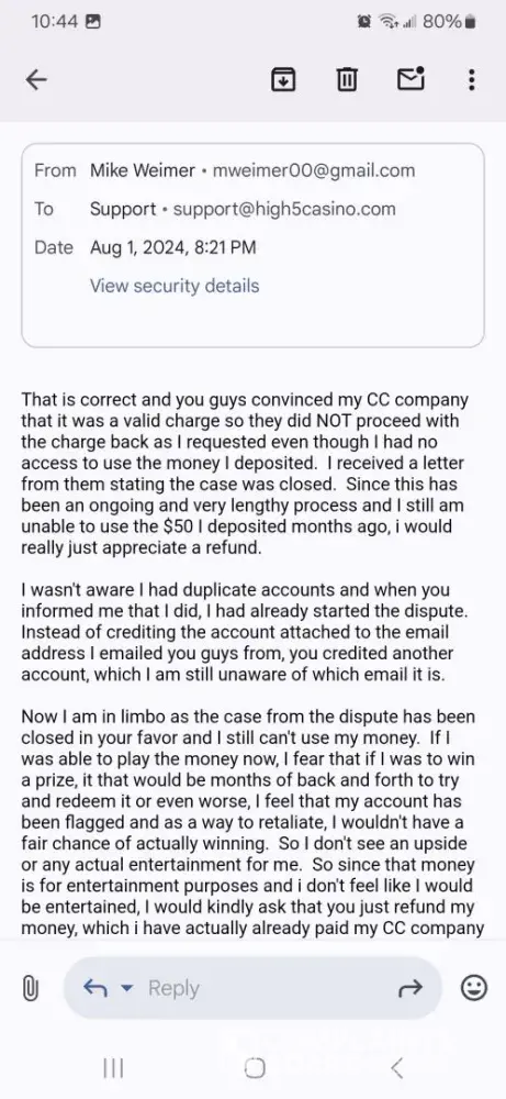 I made a deposit at the very beginning of June of 2024. It's going on almost 4 months and I still can't get my money. They claimed it was credited to a duplicate account that I have no record of having. I know that if you have multiple accounts and win they will keep your winnings. Why on earth would I deposit money to try and win knowing this. They only claimed this over a week after trying to contact someone about my deposit and after I finally opened a chargeback claim with my CC company. They had no time to respond to me but they sure did have time to convince my CC company I got what I paid for. They still have my money and honestly it's probably because I email one of the big wigs in cooperate after searching for a number to call. I guess they don't like that! I emailed them nicely asking for a refund because it was in best for both of us to just part ways and sent them without being asked a copy of my CC, my divers license, and the letter for my CC company showing the chargeback was closed. They never asked for anything when I made the deposit. Just let my card get charged but after I requested the refund they emailed me back requesting the exact same documents I had just sent over! No I'm not sending anything over. They picked my account won't even tell me which email the "duplicate" account is tied to and won't offer a solution on how resolve this! At this point it about the principal of the matter. They are criminals and need to be put on blast. I've never had a company completely still my money and give me nothing in return. When I post a review explaining the situation they send me the same generic response every time flat out says they locked my account and I have no access to my money but never offers a solution. If you're thinking about playing on this site I would seriously consider going to a more reputable site that won't steal your money and has a moral compass. I'll be opening a complaint with the BBB. I would sue them if they or headquartered in my state but they are not. Trust me when I say don't play here. You won't even get the chance to lose the money they'll just take it. Below is the response for the second time to my last review and it's identical to the previous one showing that they have time to respond to a review on this site but can't answer an email when you send them one.