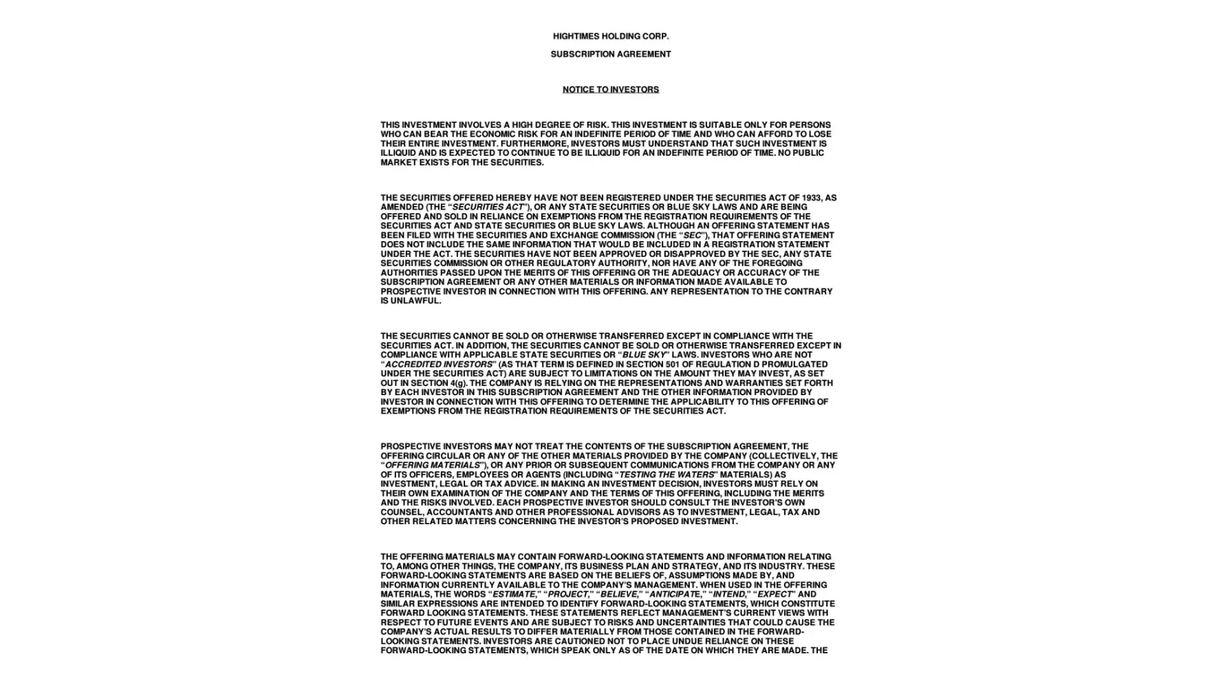 under violation for selling A1+ offerings when mandated to halt by law it is unlawful and eligible for refund My name is ***, On Tuesday June 30th of 2020 I invested $550 with high times holding corp which was the minimum amount to initiate any investment and became a "shareholder" through regulation A+ offering as seems as an continual opportunity said to expire at the time of offering in a few short days which it has not. It was stated that after escrow closes my shares will be issued via V-Stock & it is August 5th today and not one word to any investors with updates through any form. In addition I come to understand that this investment sale or any sale completed could be considered sales of unregistered securities. Taking any money while not in compliance with the Reg A ongoing reporting requirements, you are making an unregistered offering in violation of Section 5 of the Securities Act of 1933 and people who buy in those circumstances have the right to a refund with interest. Plus, that unregistered offering may be considered a disqualifying "bad act". Considering that high times should not have been offering any stocks as asked to halt sales in addition to these facts as well as following updated news on the progress it has become apparent that I am not only entitled to a refund in full under law but any possible interest & that it be returned to the card or account in which I'd made initial investment with. It is in my deepest regrets to have to do so however based off the handling of requirements, staying in touch, following law here this isn't a great start. I ask for full cooperation and ease to this and it was a leap of faith to invest in one company solely on faith from reputation and looking into further the reputations falling having not been able to follow guidelines which can prove more risky for the investors on faith for said company & with a company not moving accordingly one obviously should lose faith & get back what is there, I no longer am able to invest given the violation of selling said stocks with were not supposed to. I have called in about this and no response.