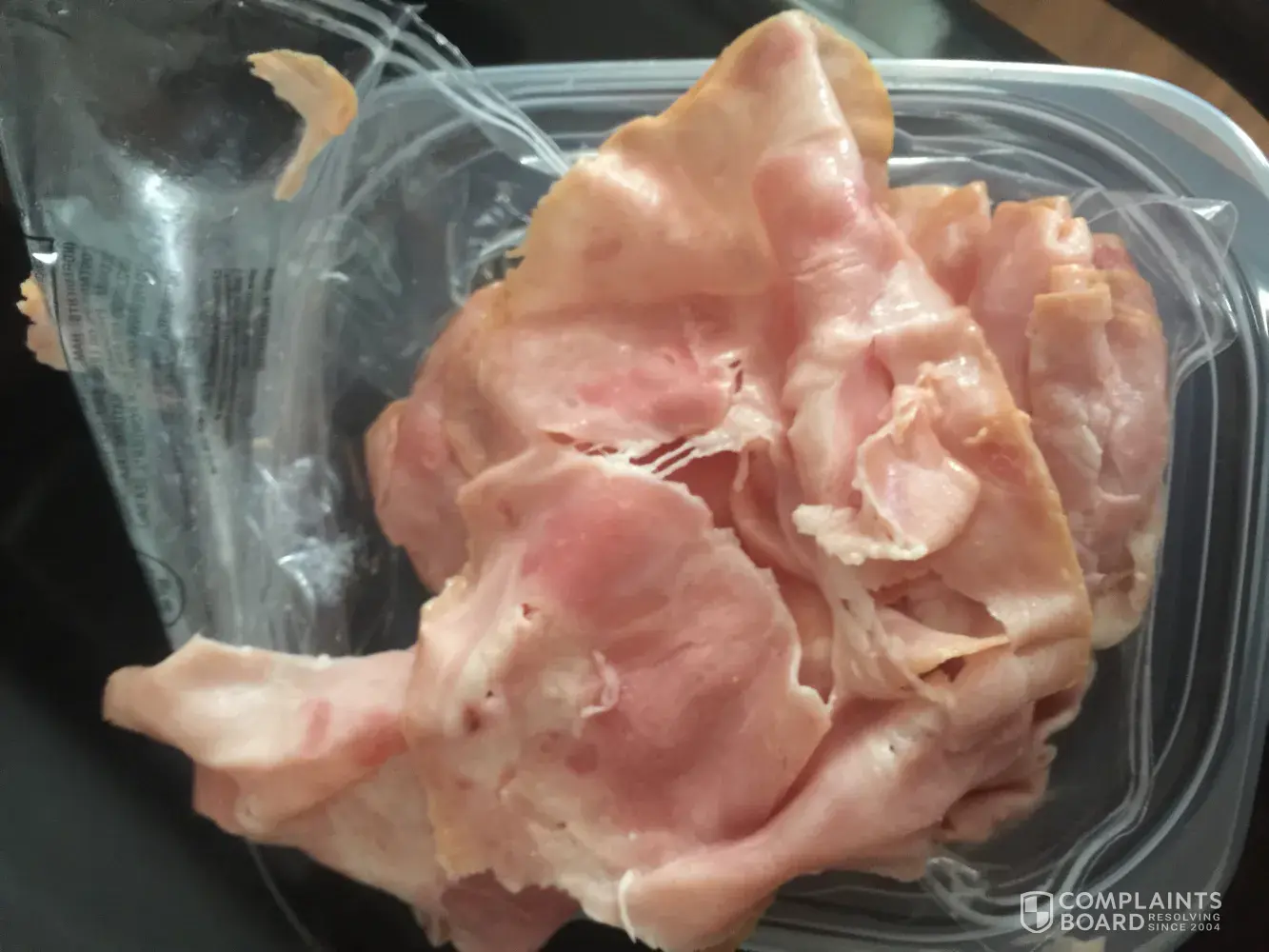 I purchased your smoked ham lunch meat at my local Walmart this week. Found several bright blue ?plastic shavings embedded in the lunch meat. Of course this was found after eating one sandwich using this meat, and upon investigation there were several more pieces of blue plastic in the same tub of lunch meat.