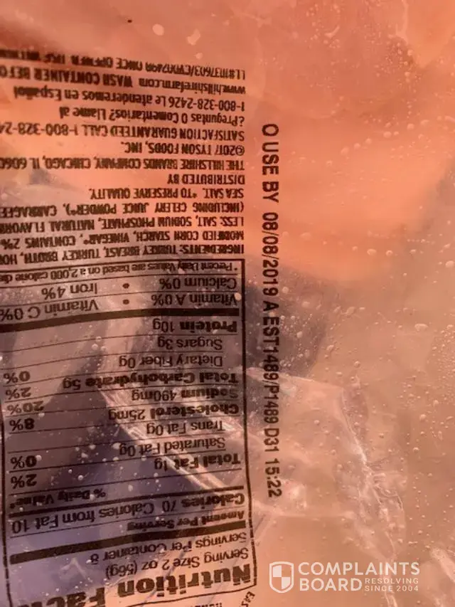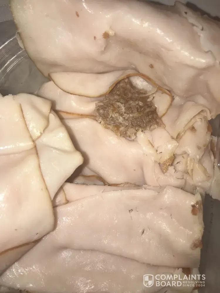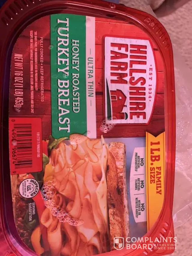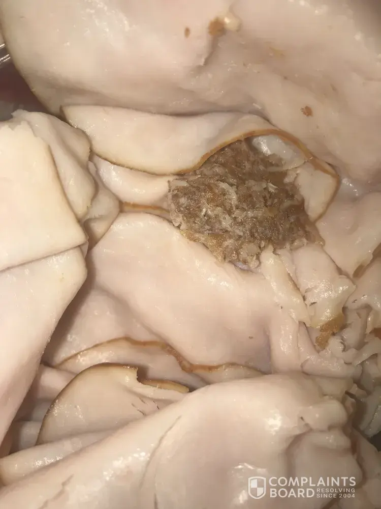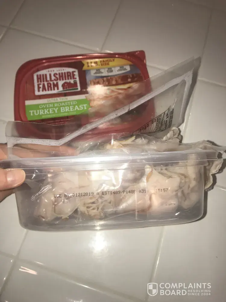 The pictures do the damage justice. I opened a new package of turkey breast deli meat on November 27 and saw an awful sight. I gag every time I look at the picture. It is absolutely disgusting! I am highly considering not purchasing "meat" from Hillshire any longer.