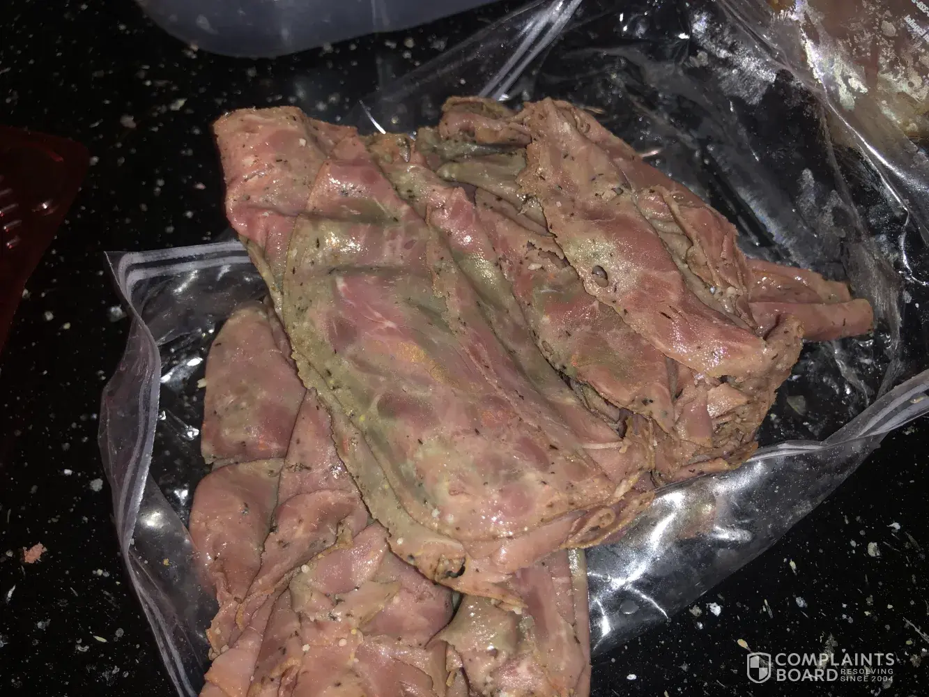 I purchased the above pastrami from Wal-Mart in Delavan, WI on March 15th, 2019 and first used/opened the product on March 19th, 2019. All was good - I made several sandwiches between 03-19-19 and 03-22-19 with no problems. On 03-24-19 I was making a grilled pastrami and cheese sandwich, only to find that the pastrami - (which was in the original packaging and in the original plastic container), was grey and spoiled.