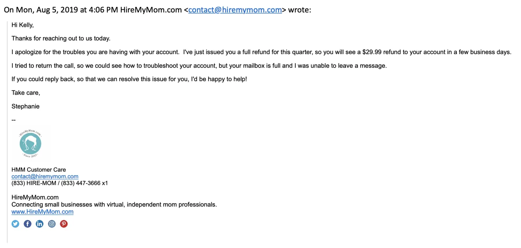 I had a really bad experience with Hire My Mom. I talked to a lady once and spent a whole weekend getting everything ready for her. I made a video and wrote out instructions in an email. She wanted me to pay her before she started working, which I thought was weird, but I did it anyway. After that, I never heard from her again. I tried calling to complain, but no one helped me. I really hate this group and I don't think anyone should use them. I paid $65 an hour and she didn't do any work at all. She just took my money and laughed about it.