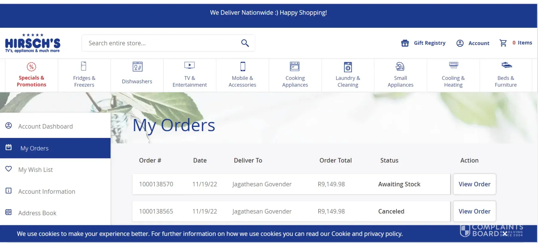 I placed on order on the Hirsch's website on the 28th of November 2022. The order was for a 9kg Defy Front Loader. I paid for the product online including a delivery fee. I was provided with and order number and on the 3rd of December 2022 I received a call informing me that they did not have the item in stock. They wanted to offer me an inferior brand...