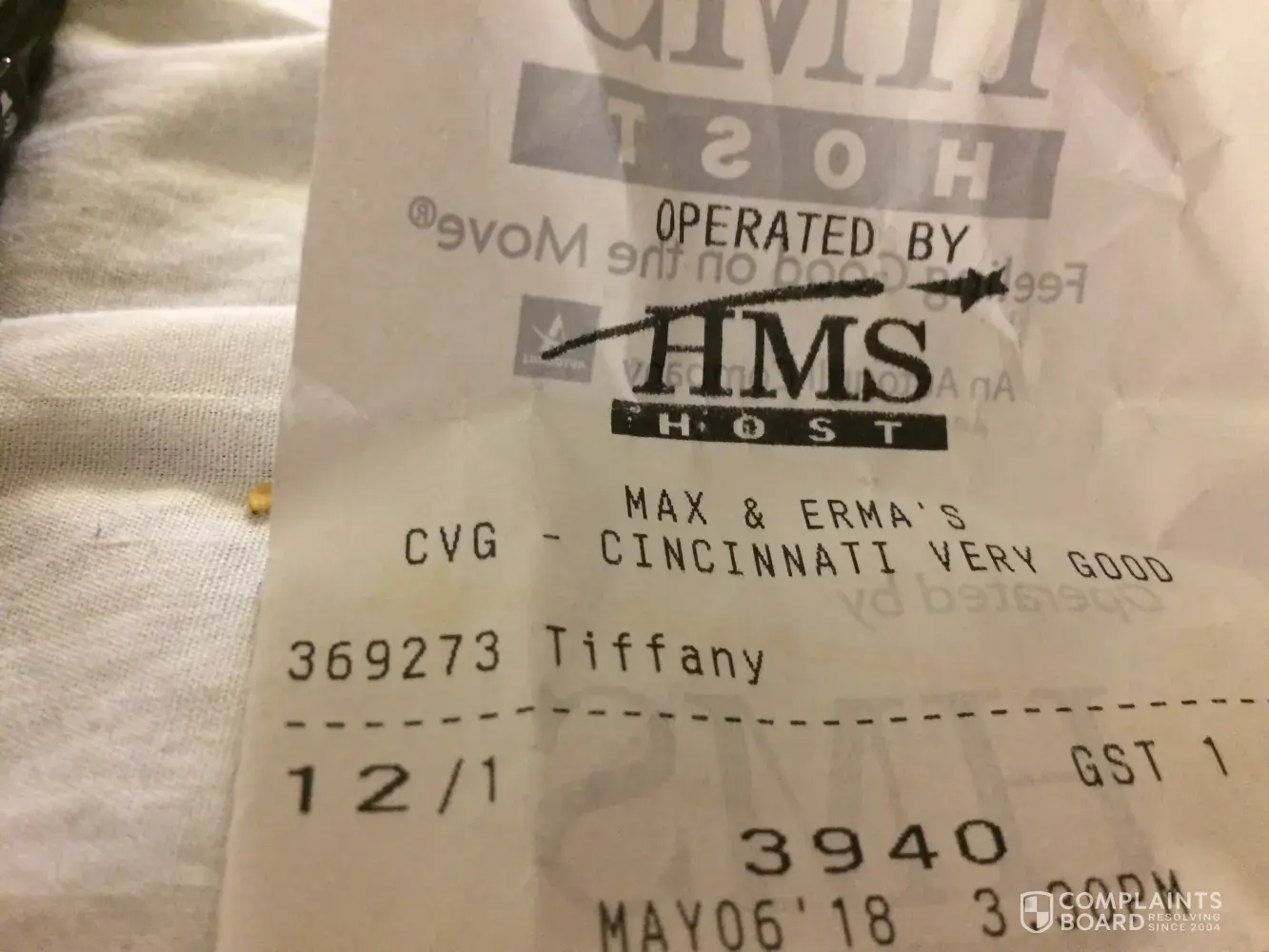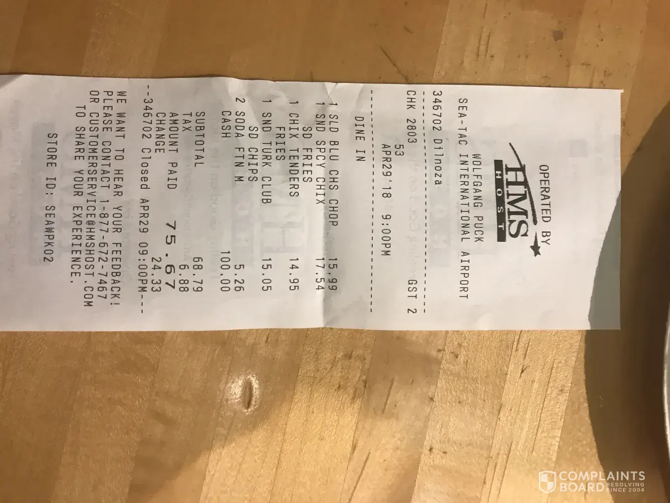Flew into Seattle airport got dinner, spent $75.67 on 4 meals and 2 sodas.