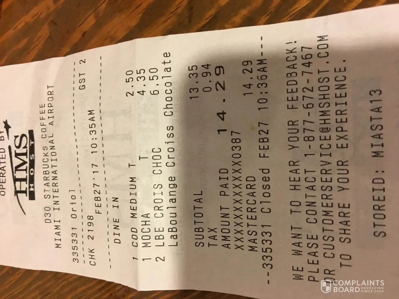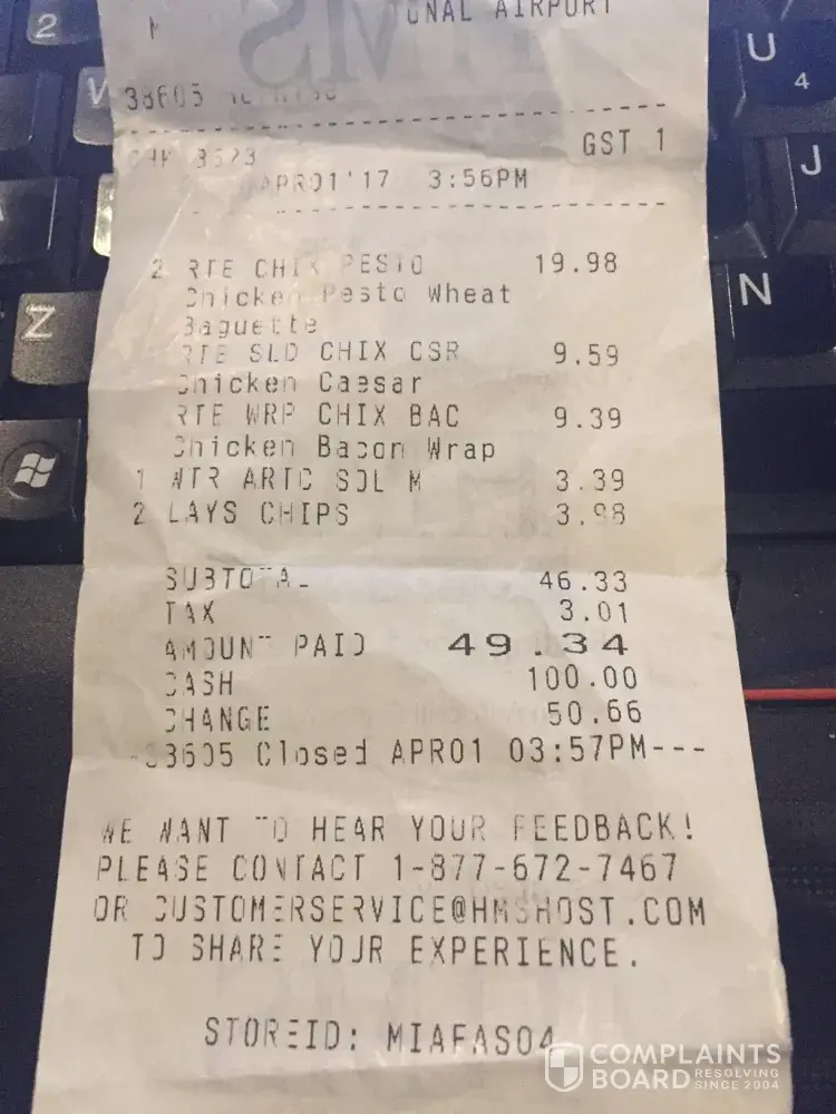 On 4/1 my wife and I had a connecting flight thru the Miami airport and stopped to eat at one of your restaraunts. My receipt shows StoreID: MIAFAS04