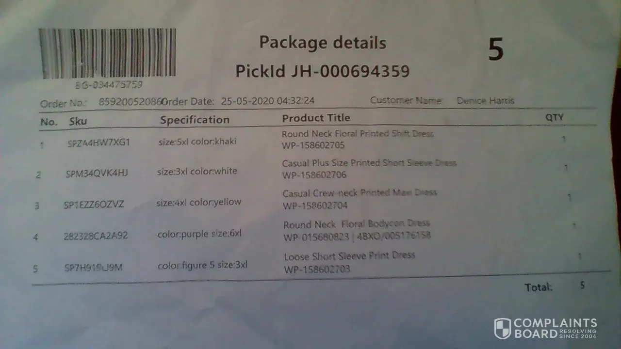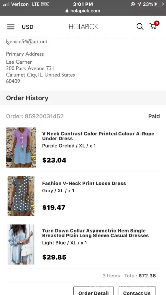 On January 19, 2020, I ordered Dresses (Order #[protected]): (1) Fashionable Loose Long Sleeved Maxi Dress, $24.66, (2) Cotton/Linen Contrast Color Casual Maxi Dress With Pockets $28.61 and (3) Sweet Heart Asymmetric Hem Plain Maxi Dress $20.16... and the total amount was $73.43, taken off my visa.