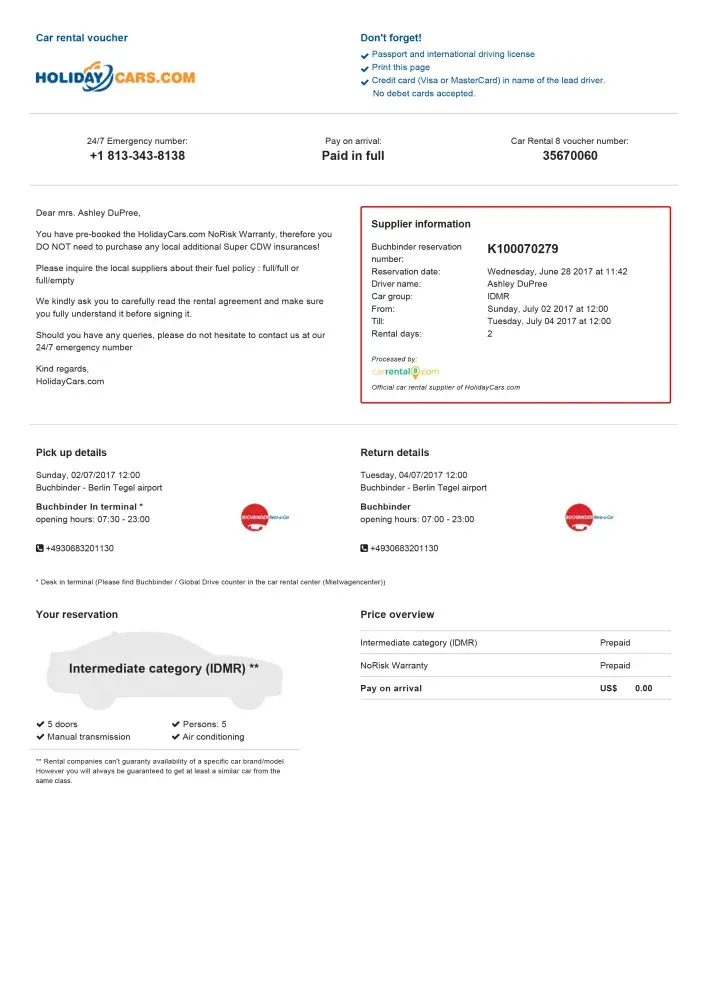 I rented a car with Holiday Cars on July 1st. I reserved the car in advance online and paid in full for the reservation. I was running late to pick up my rental, but couldn't find anything too specific about late pickup times (only late returns) so I didn't worry. When I arrived I was informed that my car had been given away. My only option was to pay for an upgrade, and I was also told that the insurance I already paid for was insufficient. I searched their website and everything I had been sent and again found nothing specific about late pick up and giving cars away. So instead of €88, I ended up spending €210. Someone at the counter (the actual rental company was called Buchbinder) told me Holiday Cars should refund the difference for me. When I contacted Holiday Cars customer service afterwards they sent me some very specific terms of service that were suddenly accessible on their website.