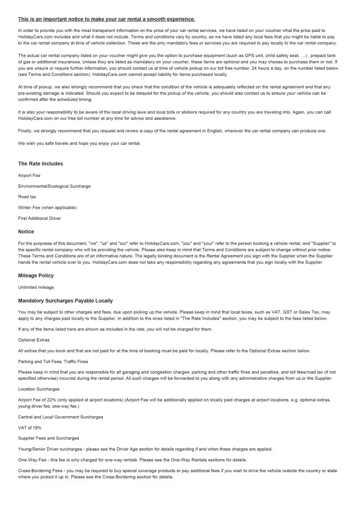 I am still waiting for them to make right on a rental I made in July. They charged my card for the "discount" price and when I arrived at the car rental place, they had no knowledge of this. It was 1 am, so I ended up renting a car at twice the amount and have yet to hear back from Holidaycars to remedy the situation. Don't use them.