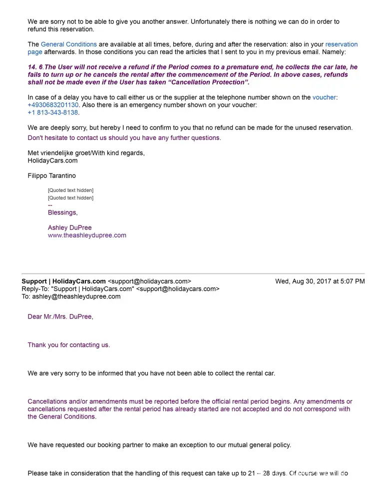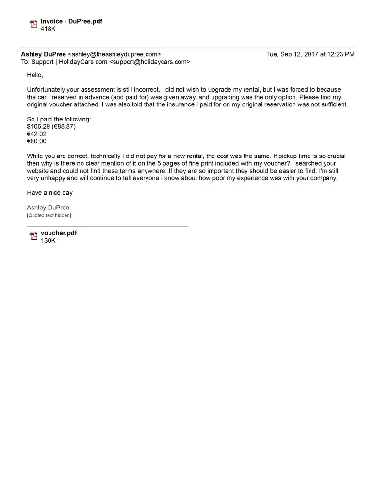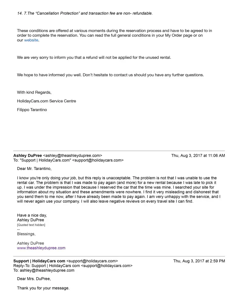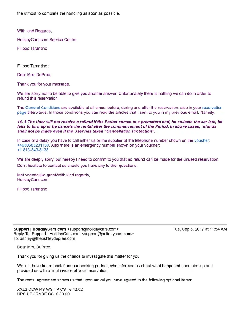 I cannot say that the experience was positive for us but eventually Holidaycars.com became "sensible" again without us having to push further into a legal lawsuit.