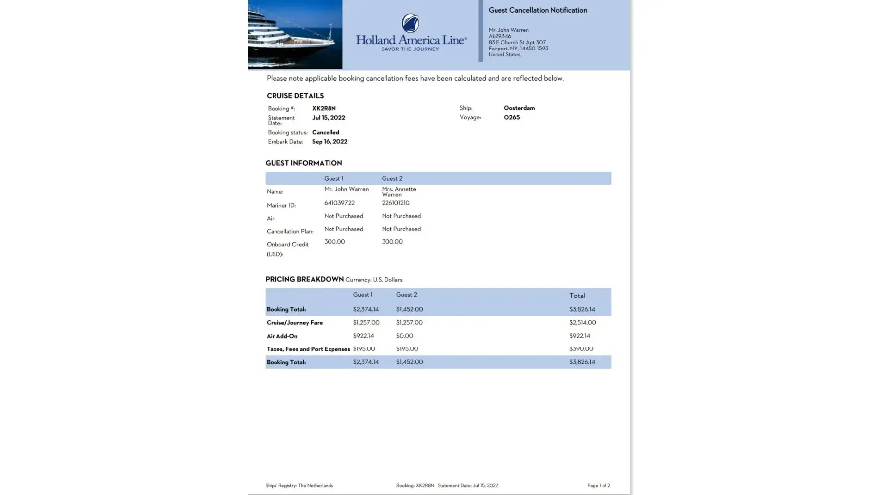 New Statendam booking XQHC2T
