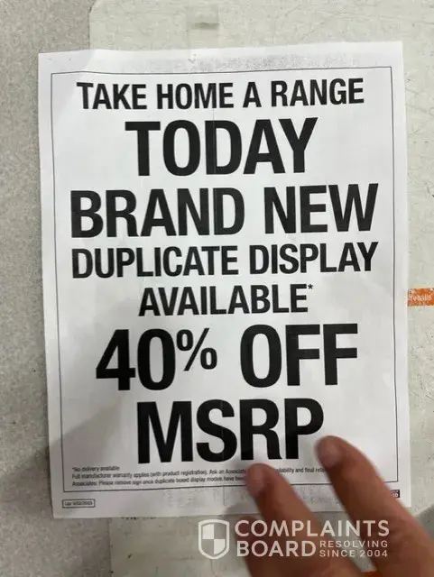 This appears to us, as well as other associates of Home Depot of deception. We were ready to purchase the GE Range for 40% off of the listed price of $1099, since the Range was called a "duplicate display".