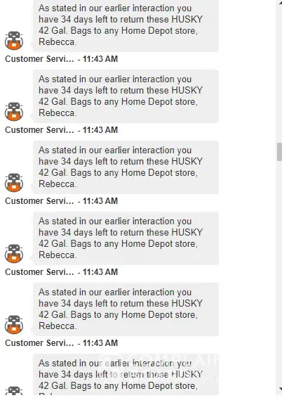 I have chatted with a rep from Home Depot and I was not able to see the # of days showing on his reply so i asked again if how much time left for the return period however he sent me a character ^^^^^^ and ask me if i know how to read. THIS IS RIDICULOUS! He did not stop there. He sent me the same messages 30 times! Home depot, pls do quality assurance with your rude agents. I'm spending a lot in your platform, and this is what I get?