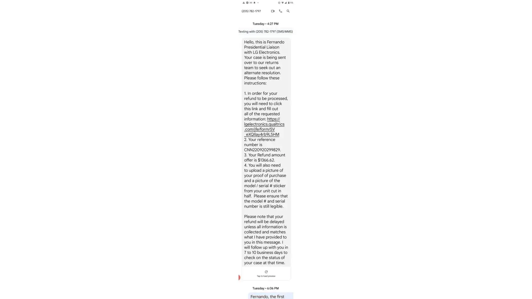 Desired outcome: LG does exactly what they said they would & mails me the settlement check for $1366.62 they "offered" as compensation. I have all documentation including screen shot of Fernando's "offer" text stream.