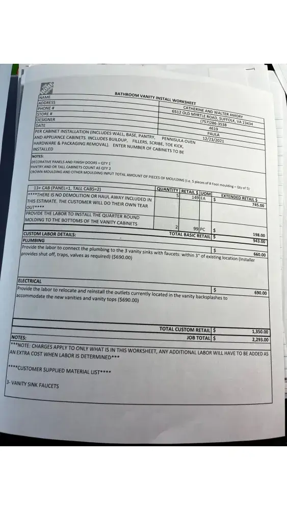In January 2022 I ordered cabinets, vanities and flooring from Home Depot and was told that order would be fulfilled in May 2022. To date I have a house full of damaged cabinets taking up over two rooms in the house. Home Depot has given me excuse after excuse. An installer came and installed the 2 bathoom vanities bottoms but both are damaged. I have called Home Depot multiple times with no resolution. I have called the installer multiple times and get no response from anyone. To date I have paid Home Depot more than $30,000 for kitchen and bathroom remodel.