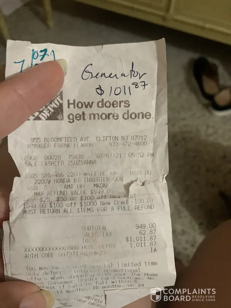 Bougth the Honda eu2200i Generator in Home Depot Clifton NJ to bring to the Caribbean. Bought it July 7. 2021 and I traveled at the end of July 2021. Cost me $230 to ship it via UPS Ground as the airline couldn't guarantee TSA would have allowed the generator to go through. They said TSA sometimes allows brand new generators to go through and sometimes it does not. Used generators are never allowed. (In retrospect, they would have not allowed it to pass as they would have seen it was already used but I didn't know that bc the airline said the box had to look sealed the way it comes from the retailer). Plus other expenses I had to incur. When in the Caribbean a storm was approaching and we opened the box to get the generator to work. When we opened the spark plug area to put in the oil there was gunk and crusty oil all around it. The chord to start the generator was ripping apart. There was some mud and in a small area there's a few small holes on the body of the generator. Then we realize the box says Honda eu2200i and the generator says Honda2000 model and on top it did not turn on even! So someone switched the new model for an old model and wrapped it in a way that looked like the box came from the manufacturer. We returned it at the store down there but they don't sell that generator and that's the one we want bc it is very quiet. They said they could only give me a store credit but I don't live down there and the cost was $1011.00 After 2.5 hours of asking for a refund, surrounded by 3 managers and 3 employees, they said we could pick up the check with the refund in two weeks but has been 3 weeks. We feel we are given the run around. Spoke to managers in NJ as well and they all say there's nothing they can do except giving the money back but we are not even getting that. Plus this generator seems nobody has it in any store and we want to buy it again but nobody helps with that after going through this nightmare. As a matter of fact I had one manager say to have someone switch a generator in a box is very unlikely. I did not make this up! Home Depot sold me an old, used up, non working Honda generator as if it was new in a sealed box and nobody can do a thing about it. I don't blame the employees nor managers as their hands are tied. But the company itself makes it impossible for anyone in a leadership position to make a decision during fraudulent, odd, unique circumstances.