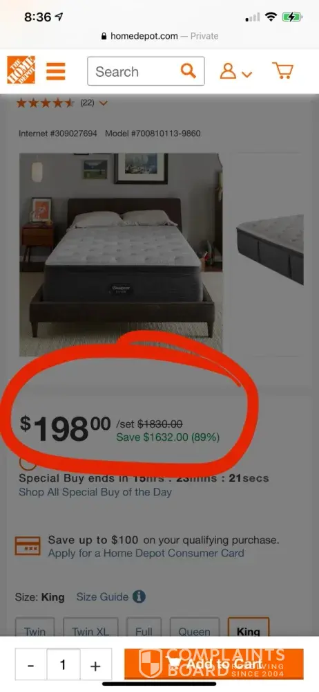 I purchased a kingsize beautyrest 16.5in mattress and box spring on Saturday July 17th for the amount it was advertised for ($198) by Monday I receive a email stating HomeDepot has canceled my order due to a pricing error. I don't see that being the my (customers) problem especially after it already has been purchased and customer received email confirmation about the order.