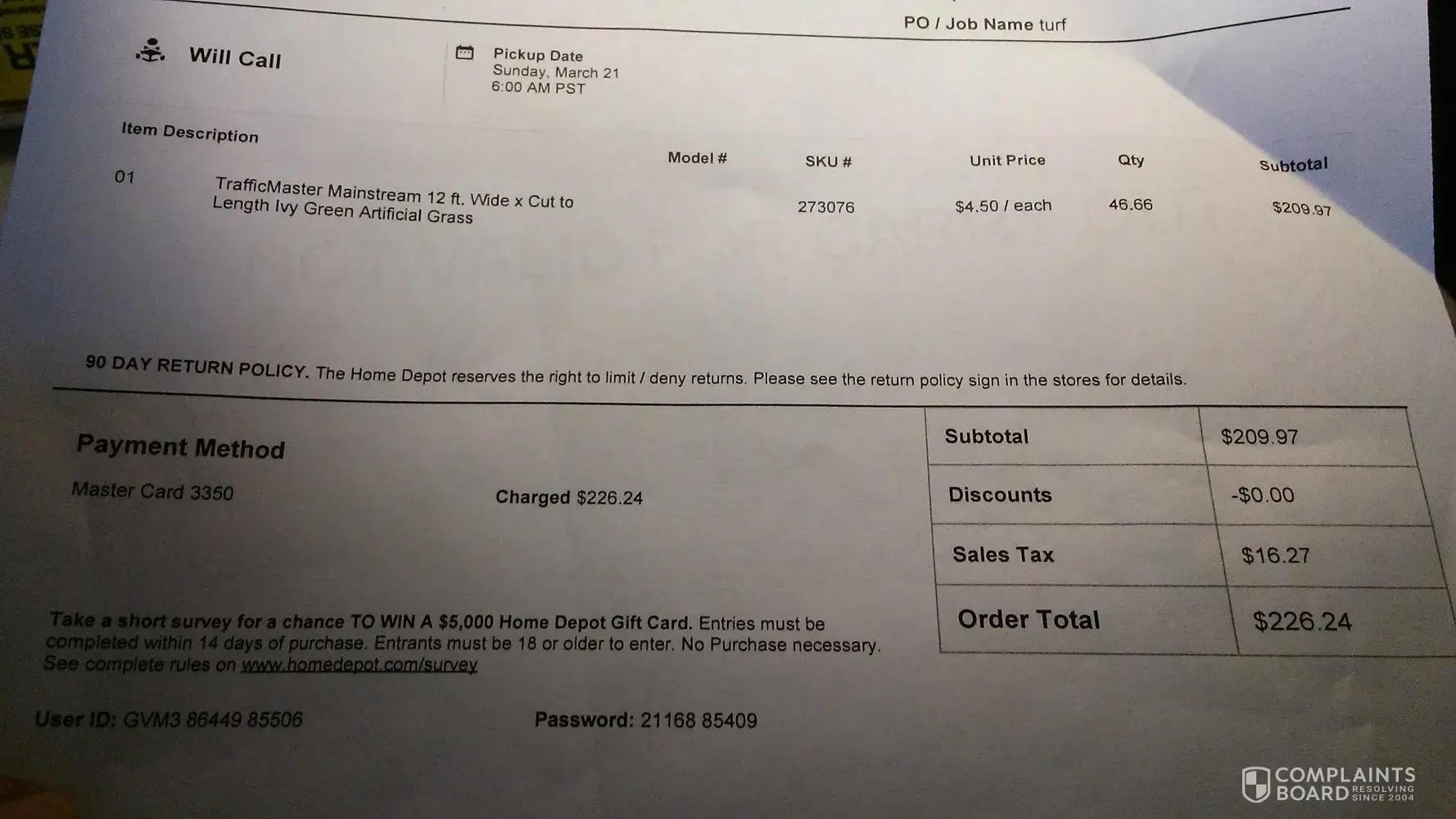 03/21/21 My girlfriend Diane ordered Traffic Master Mainstream Green Artificial Grass Thursday 03/18 for pickup Sunday. Originally we have been waiting for restock from the Simi store where I live, (Boyfriend). I spoke to the flooring person 03/18 in Simi to check stock and he told me that the T.O. Camarillo and Oxnard store had plenty. I even called the Oxnard store and was told there is plenty and have your girlfriend call and order and we'll have it ready. We needed a 40 foot roll so Diane ordered it from Oxnard which was closet to her home in Ventura and paid for it with them giving the impression they will cut and have it waiting. I had help come up from Simi Sunday morning to pick up, and prep work had been done to the ground, (leveling and lined) and after being being told earlier from your automated service there would be an email to confirm order readiness that we never received and then being placed on hold for 45 mins and shuffled around just to find out the ordered could not be filled and a rep who could care less that there is frustration leaves a bad experience and why she cancelled and we'll never recommend your Oxnard store. Poor Customer Service and Service.